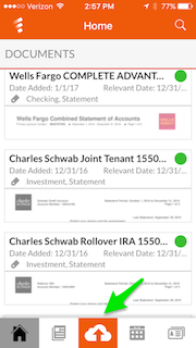 If you use the FileThis Cloud for document storage, the FileThis app lets you take pictures of documents, such as receipts, to upload to your account. In addition, you can upload other pictures that reside on your phone. (Note that if you receive a document via email on your phone, you can simply forward it to your FileThis account from your email.) To get started, download, install, and launch the iOS app or Android app (if necessary). Login to your FileThis account and display the Home screen.